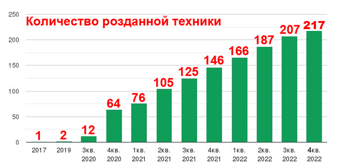 За все время существование проекта на январь 2023 года мы приняли 334 монитора, 252 системных блоков, 52 ноутбука и нетбуков. Кроме этого были получены детали для системных блоков, клавиатуры, мыши и другие вещи, которые нужны для существования проекта.